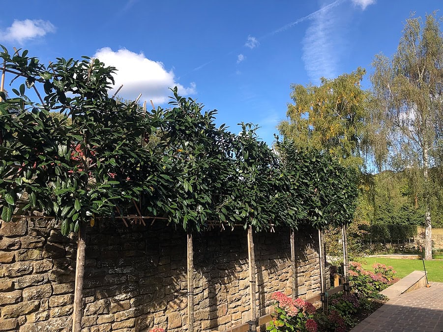 Used as a pleached tree or hedge on stilts, this evergreen variety has glossy dark green leaves that provide screening and privacy all year round. In spring, pleasantly scented creamy flowers are produced, followed by dark fruits in the autumn, which are great for wildlife, but inedible for human consumption. This tree can tolerate most soils and planting conditions except very wet soil and chalk.