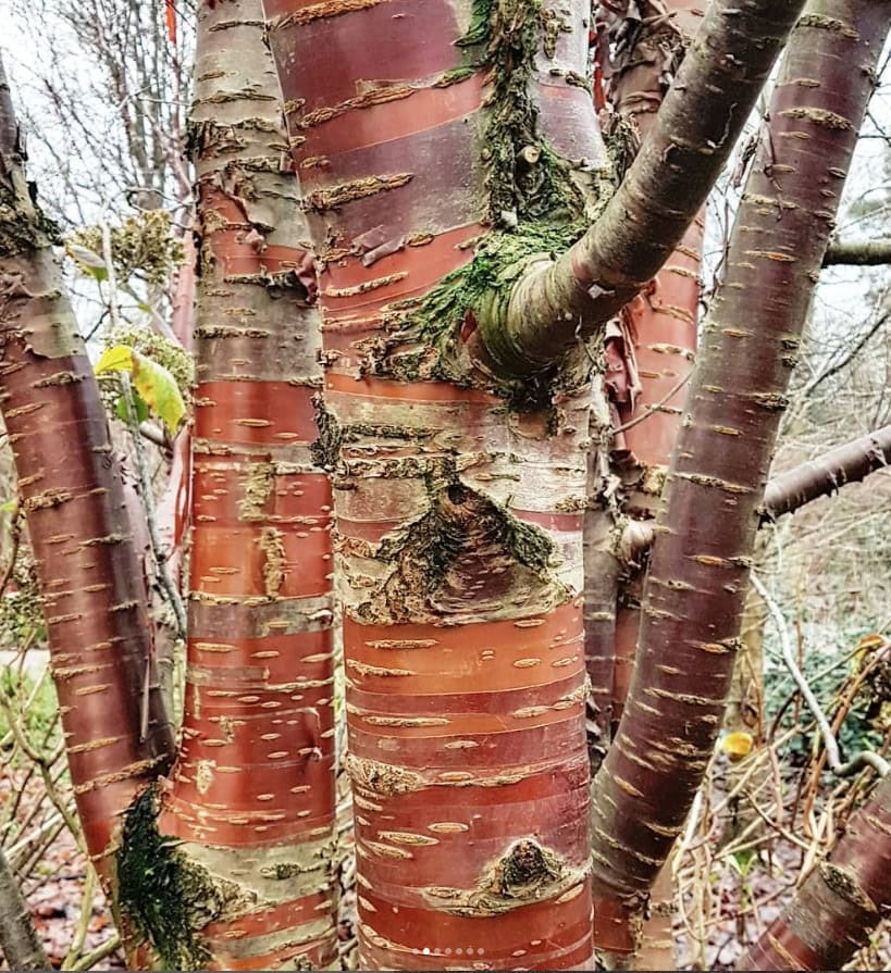 Also known as Tibetan Cherry, unlike other ornamental cherries the blossom or fruit is not the main event with this variety. Prunus serrula is famous for it's fabulous, shiny burgundy-bronze peeling bark which looks amazing in every season. It is a small deciduous tree grown as either a multi-stemmed form to make the most of the ornamental bark or single stemmed with a rounded canopy. Narrow green leaves look beautiful fluttering above the bronze trunk in summer and turn butter yellow in autumn. Small clusters of white flowers appear in spring followed by clusters of fruits. We love to grow this cherry as a multi-stem, in small groups through small grasses like Hakonechloa and low planting with cool blues, purples, whites and greens which contrast the beautiful eye catching bark. Also perfect for large planters and easy to grow.